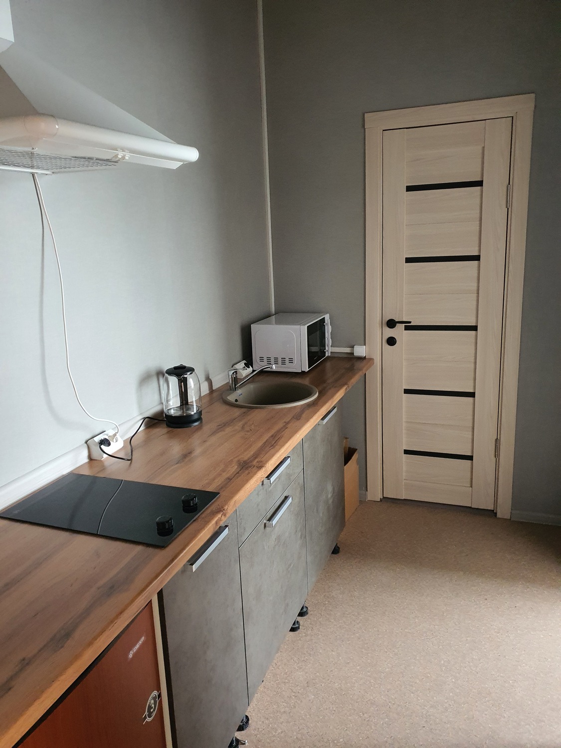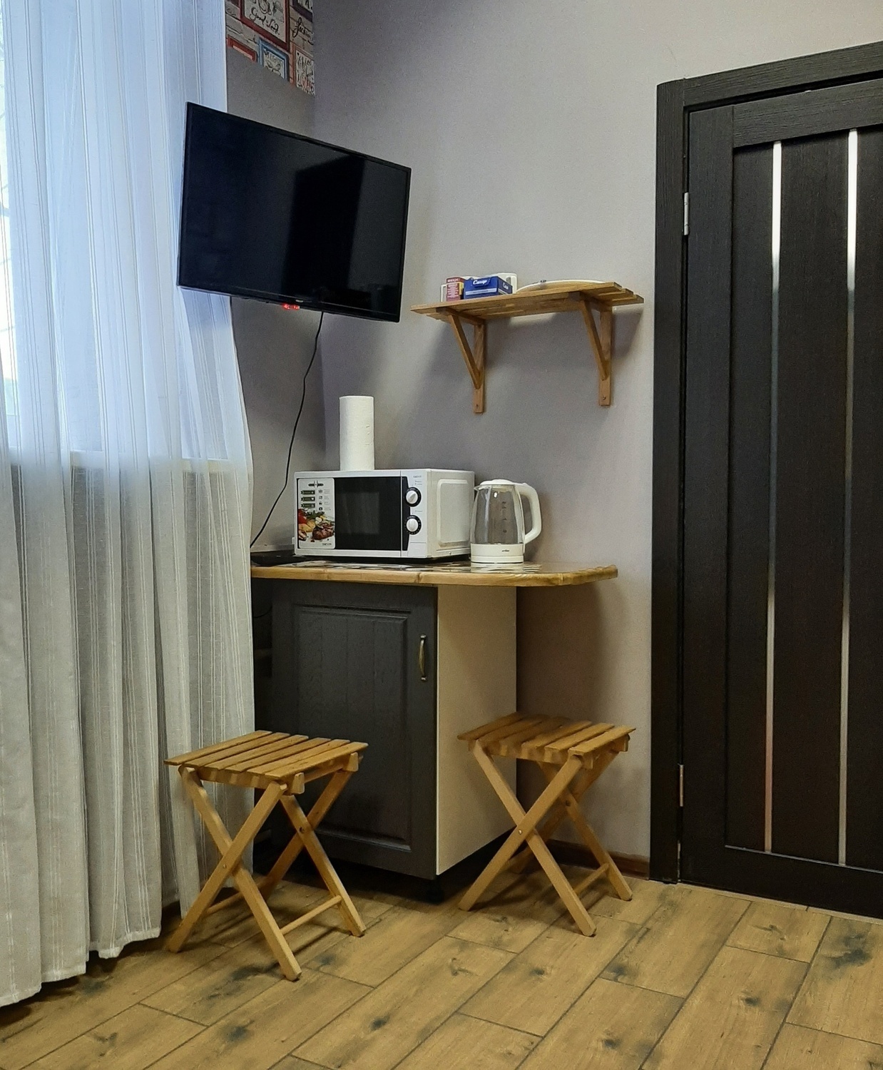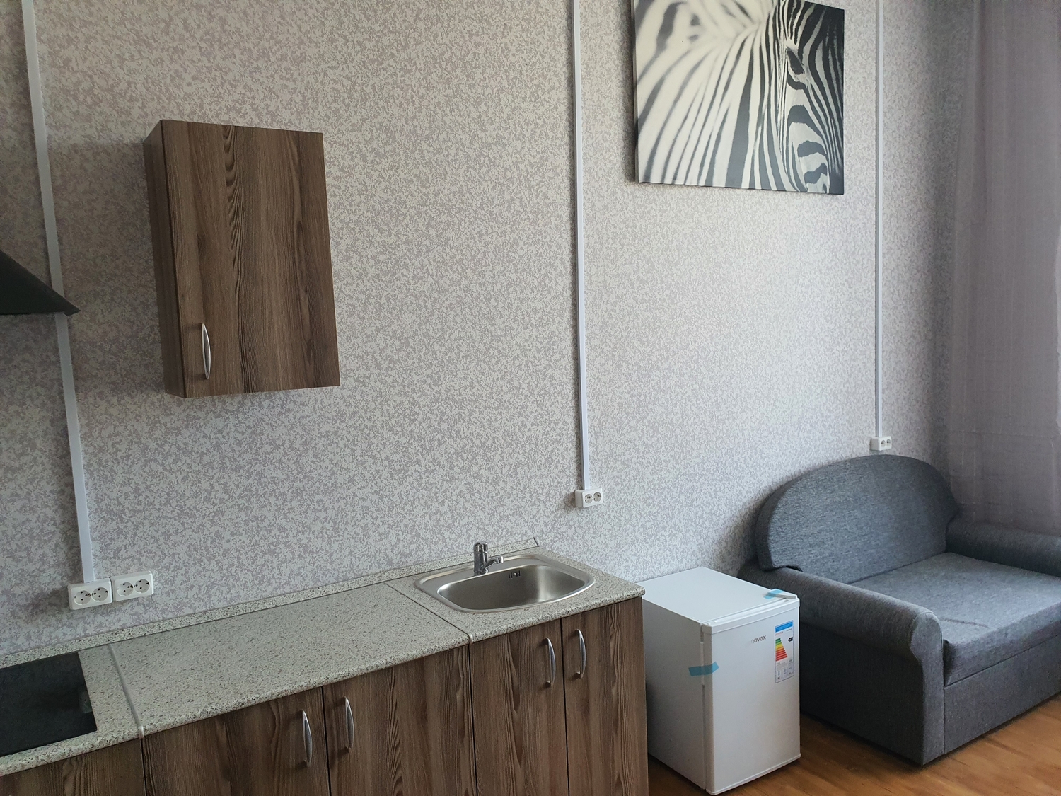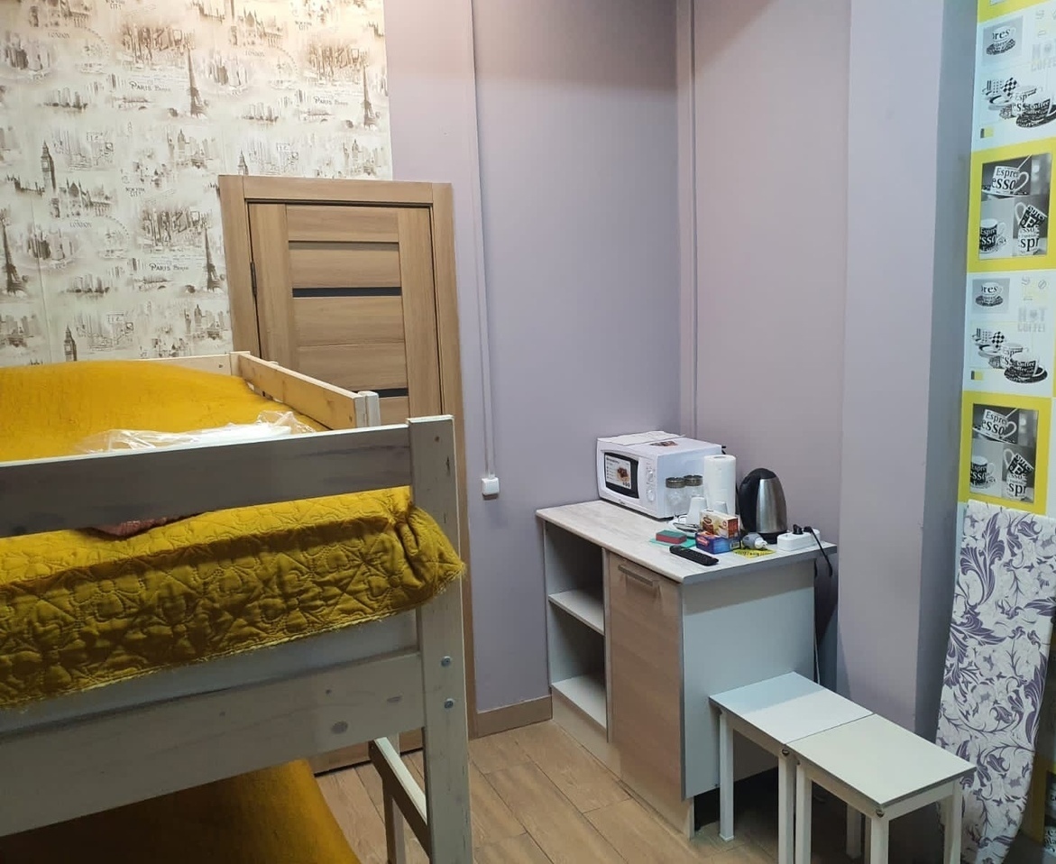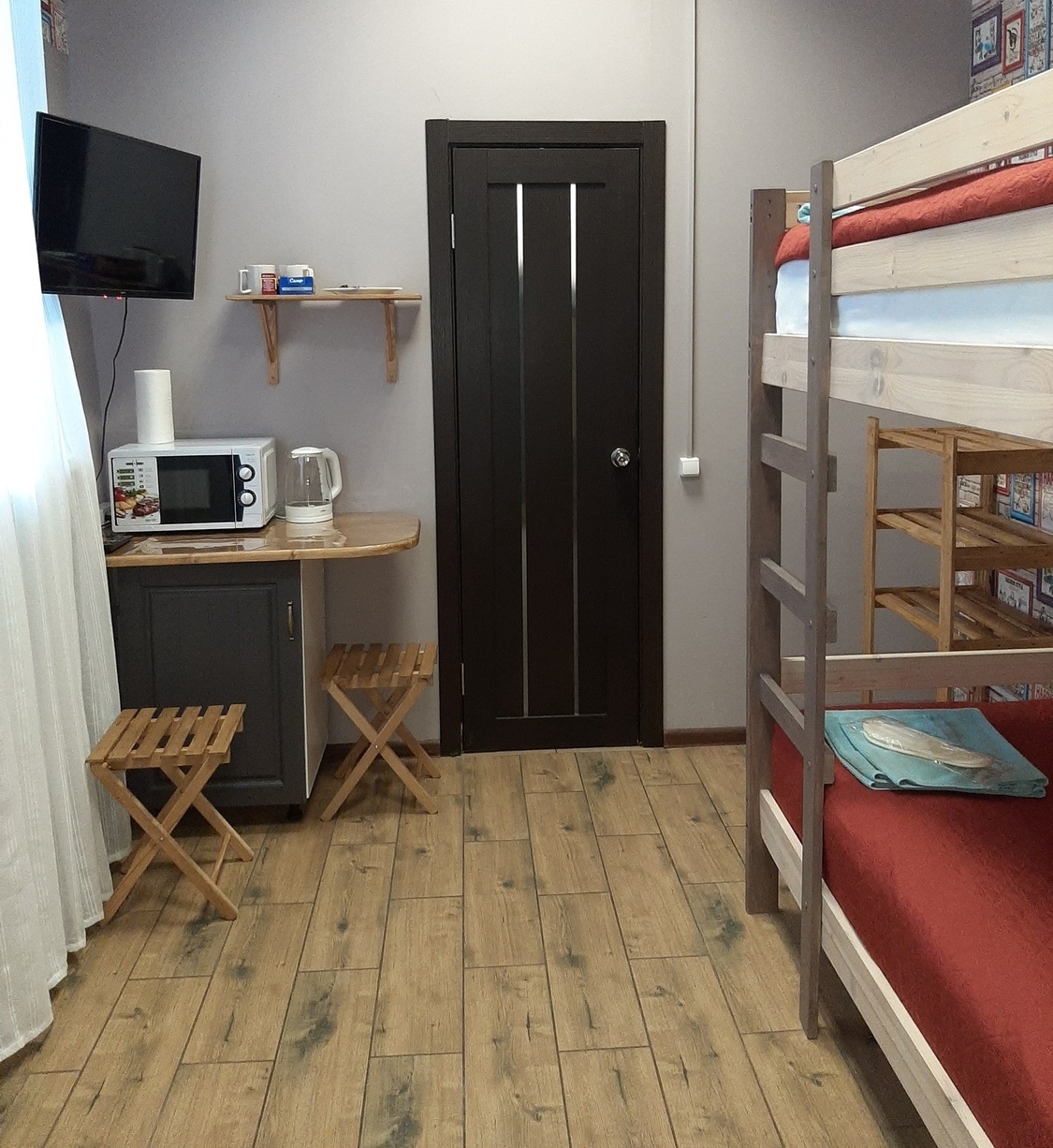 Студия с двухъярусной кроватью, отдельной ванной комнатой, микроволновкой, холодильником на 1 этаже. Площадь 15м2. Кухня отсутствует.