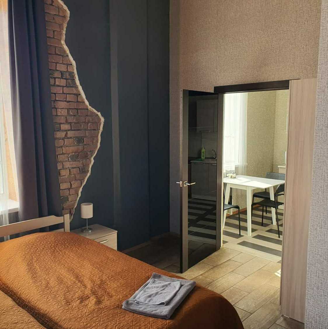 Однокомнатные апартаменты на 2 этаже. Одна двухспальная кровать, журнальный столик и ванная комната, туалет, кухня со всем необходимым для комфортного проживания. Площадь 38м2. Вид на Кремль и набережную реки.